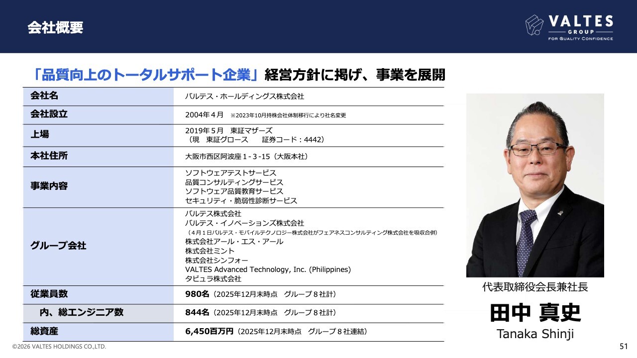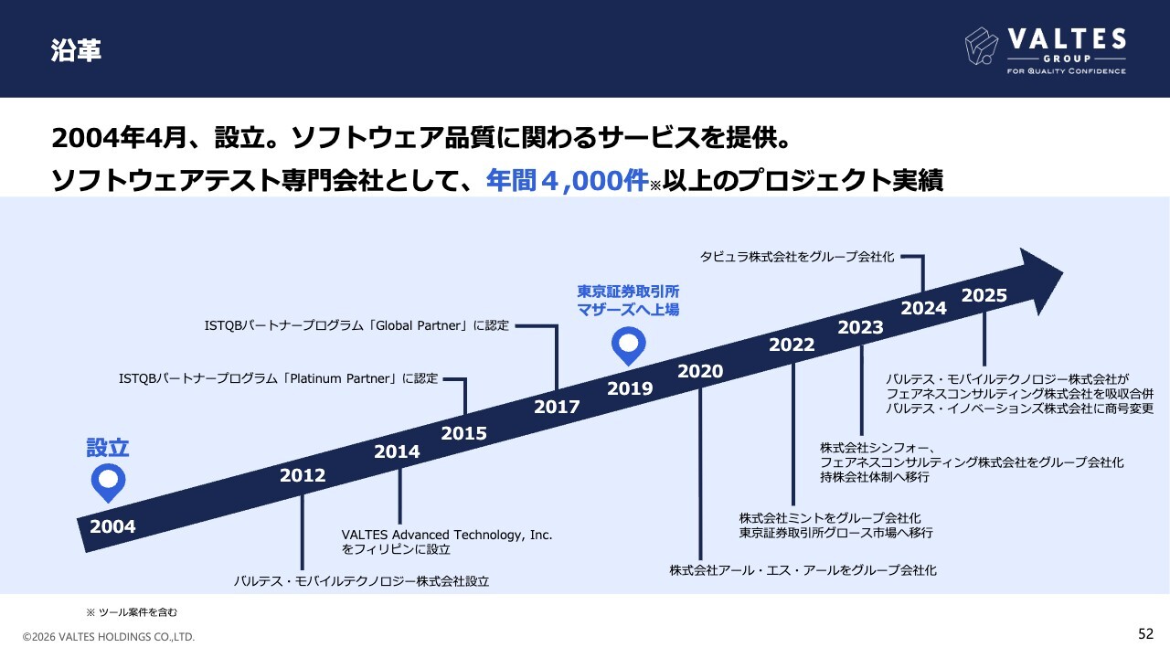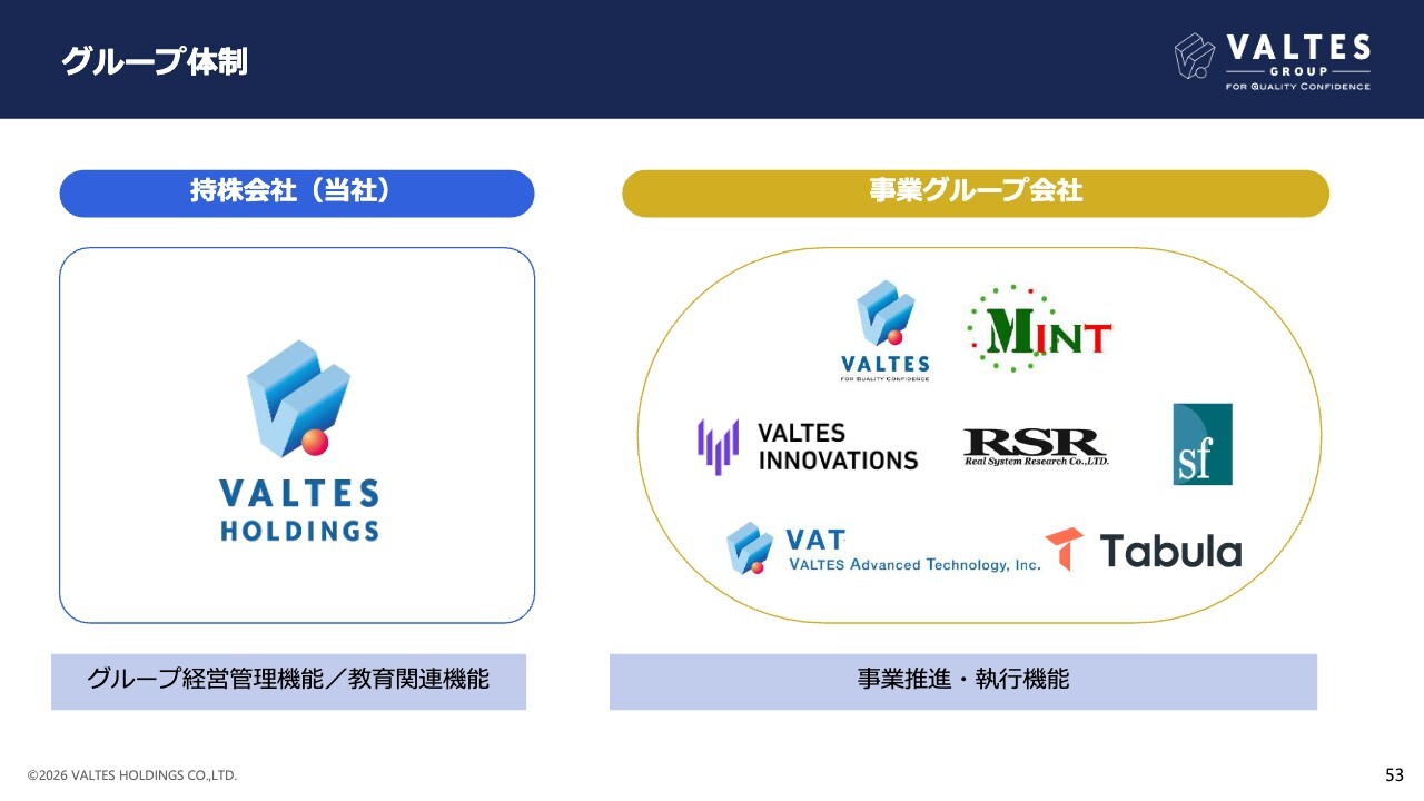 2023年10月には持株会社体制へ移行をしました。テスト事業を、事業会社である、バルテス株式会社へ承継し、当社はバルテス・ホールディングス株式会社へ社名を変更しています。前期はM&Aにより、タビュラ株式会社をグループインし、事業の範囲を広げています。
