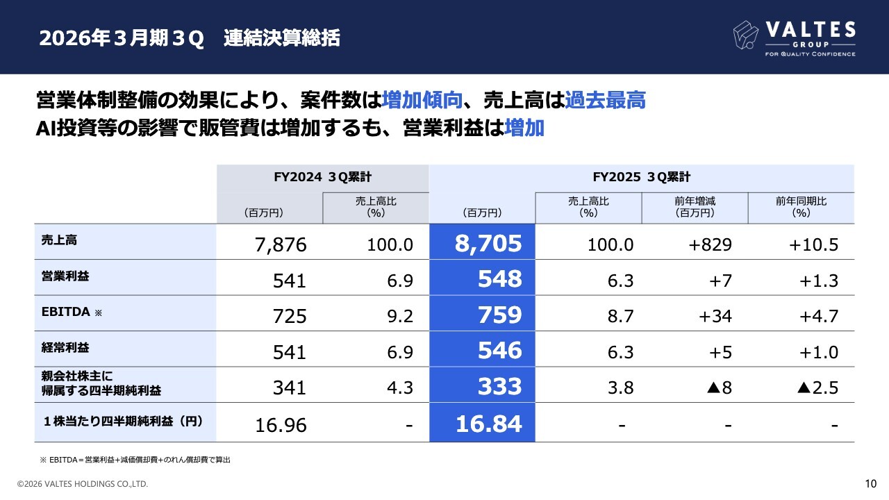 営業利益は、前年同期比700万円増益の5億4,800万円、営業利益から、M&Aにかかるのれんの償却影響などを除いたEBITDAは、前年同期比3,400万円増、4.7パーセント増益の7億5,900万円となりました。
