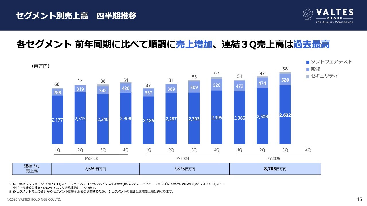 タビュラ株式会社のグループインにより、開発事業も着実に成長しています。セキュリティ事業も堅調に拡大しており、これらの結果、連結第3四半期の売上高は過去最高となりました。
