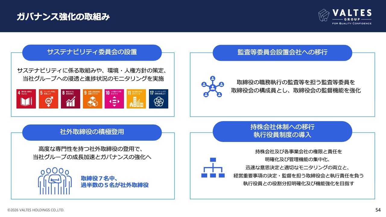 ガバナンス強化の取り組みです。近年は、社外取締役が過半数を超え、かつ監査等委員会設置会社への移行や持株会社体制への移行等、さまざまな施策の実施を進めることで、グループガバナンスの強化・確立を進めています。