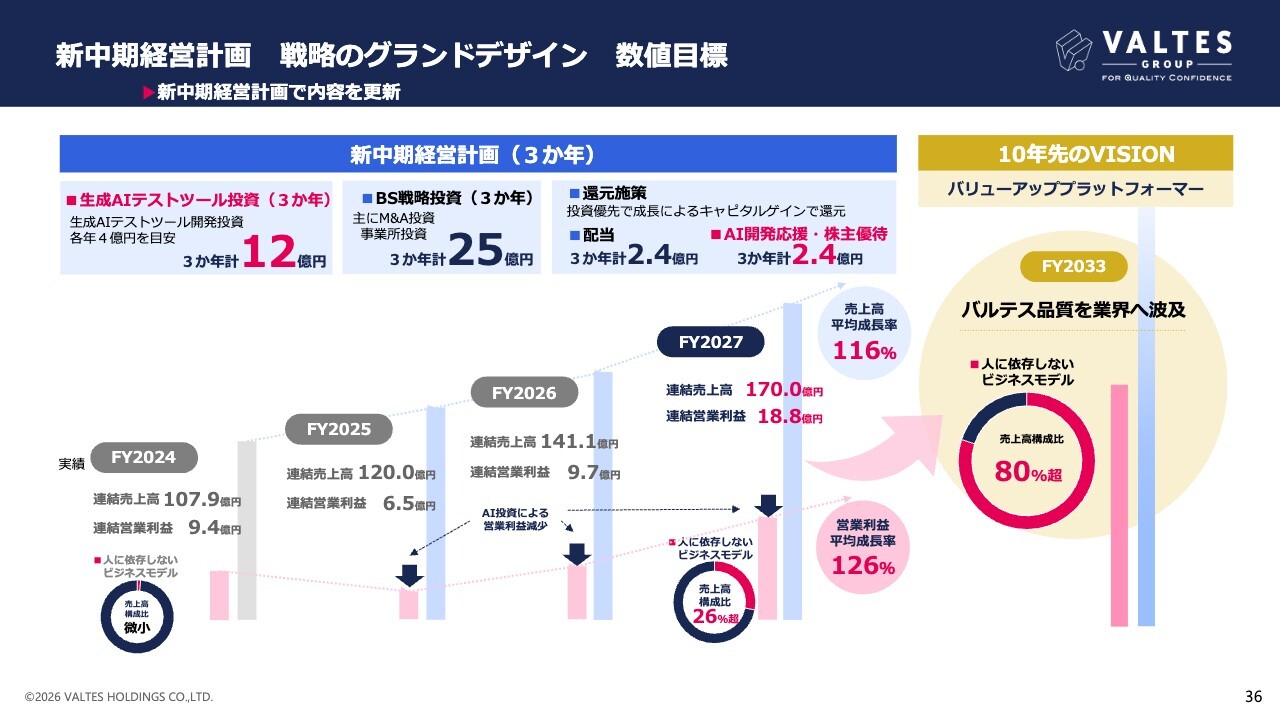 新中期経営計画の数値目標になります。3ヶ年で計12億円の生成AIテストツール投資および計25億円の、BS戦略投資を実施することで、最終年度FY2027における売上高は、170億円、連結営業利益は18.8億円まで成長する見込みです。売上高平均成長率は116パーセント、営業利益平均成長率は126パーセントを想定しています。