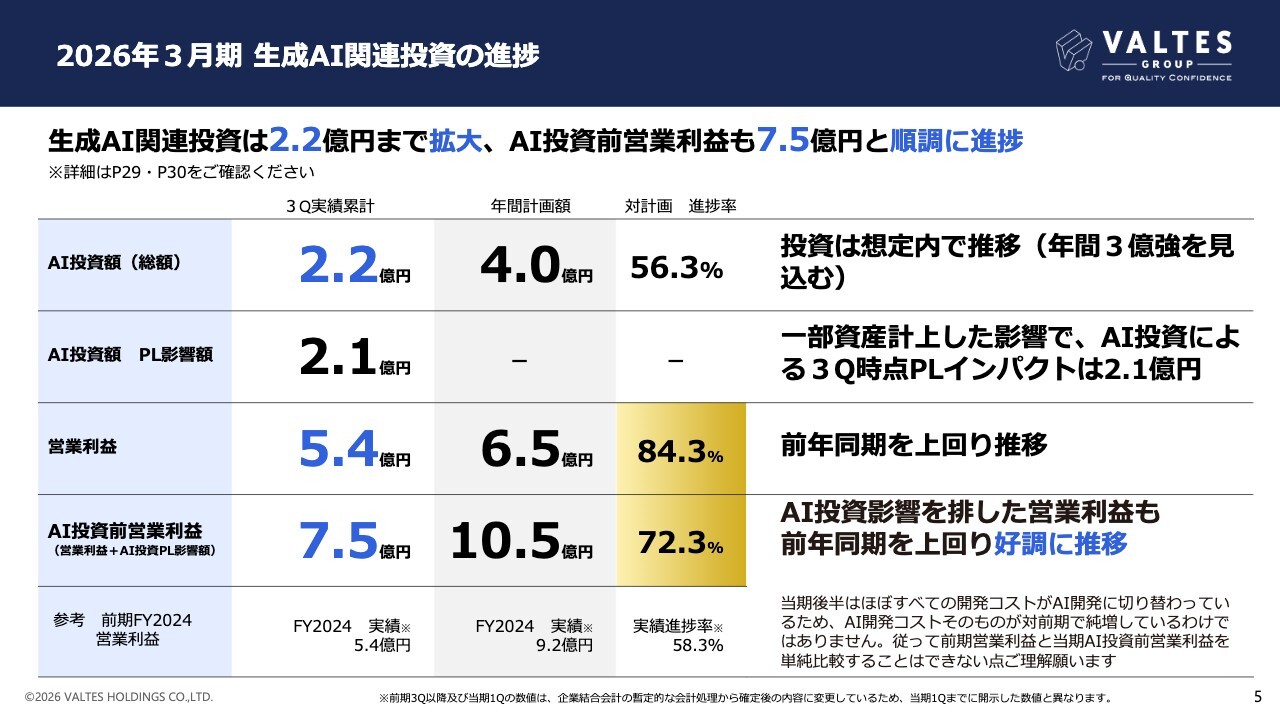 これらAI投資影響を排した実質的な営業利益は7億5,000万円となり、年間計画値の10億5,000万円に対し、72.3パーセントと高い進捗率となっています。