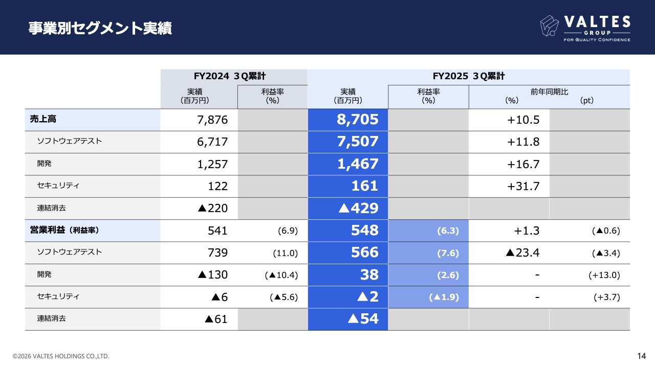 まず、売上高ですが、ソフトウェアテスト事業は、前年同期比11.8パーセント増加の、75億700万円となりました。開発事業は、前年同期比16.7パーセント増加の、14億6,700万円となりました。セキュリティ事業は、前年同期比31.7パーセント増加の、1億6,100万円となりました。