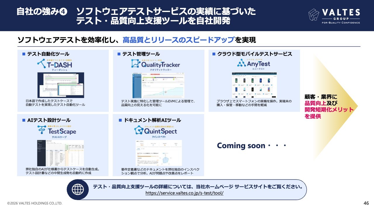 また、ツールビジネス全般に生成AI機能を拡張し、テスト工程の全面的な自動化を推進します。加えて、ツールビジネス、教育ビジネスの拡大にも積極的に進めていきます。