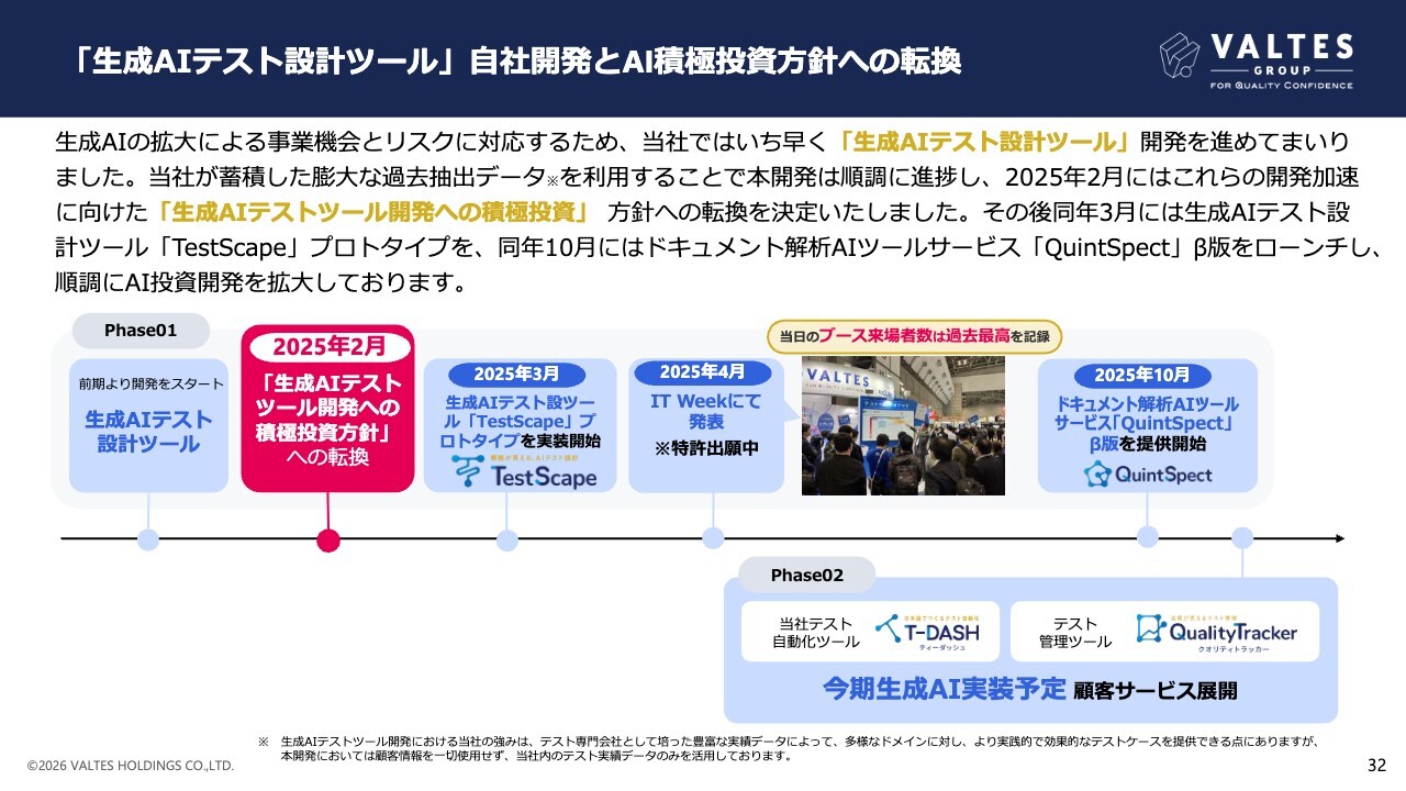 生成AIの拡大による事業機会とリスクに対応するため、当社ではいち早く「生成AIテスト設計ツール」開発を進めてきました。当社が蓄積した膨大な過去抽出データを利用することで、本開発は順調に進捗したことから、2025年2月にはこれらの開発加速に向けた「生成AIテストツール開発への積極投資」方針への転換を決定しました。