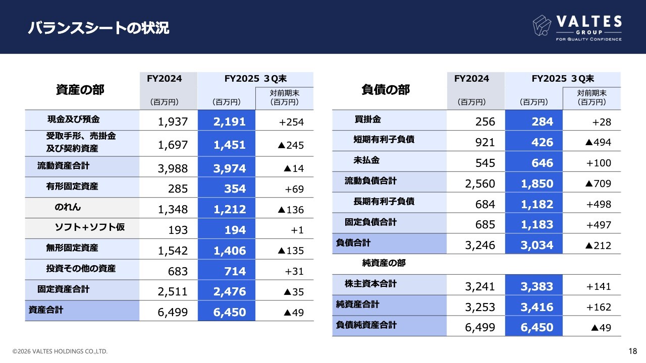 バランスシートの状況です。M&Aの投資借入金を長期化した影響で、短期有利子負債が減少し、長期有利子負債へ振り替わっています。