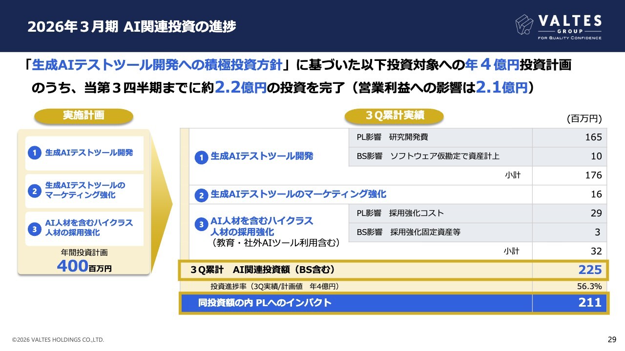 当期は年間4億円規模の生成AI関連投資を予定していましたが、第3四半期において累計2億2,500万円の投資を実施しました。なお投資の一部は資産計上されているため、P/L影響投資額は2億1,100万円となりました。