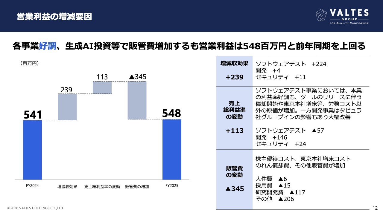 売上総利益率の変動によるプラス効果は、1億1,300万円となりました。ソフトウェアテスト事業においては、本業の利益率好調も、ツールのリリースに伴う償却開始や東京本社増床等、労務コスト以外の原価が増加し、利益率は若干低下しました。