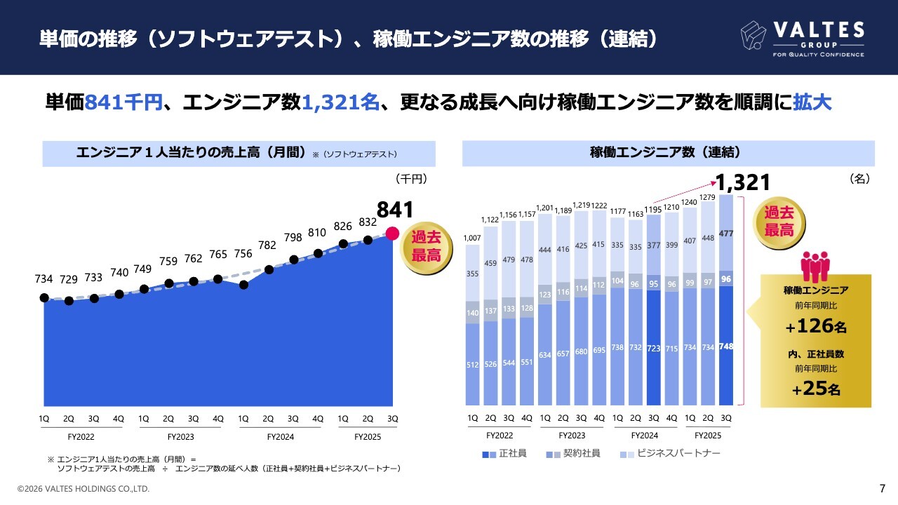 ソフトウェアテストセグメントの単価と、連結の稼働エンジニア数の推移です。単価は84万1,000円となり、過去最高を更新しました。グループ全体のエンジニア数は、1,321名とこちらも過去最高となりました。そのうち、正社員748名、ビジネスパートナー477名とともに増員となり、適切なバランスを維持しつつ受注拡大に対応していきます。