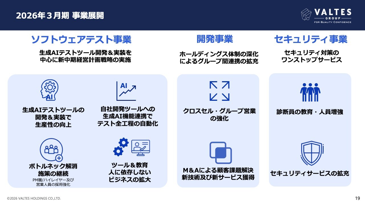 2026年3月期の各セグメントの事業展開です。ソフトウェアテスト事業では、2025年6月に発表した「新中期経営計画」に基づき、生成AIテストツールの開発および実装を強化し、生産性の向上を目指していきます。