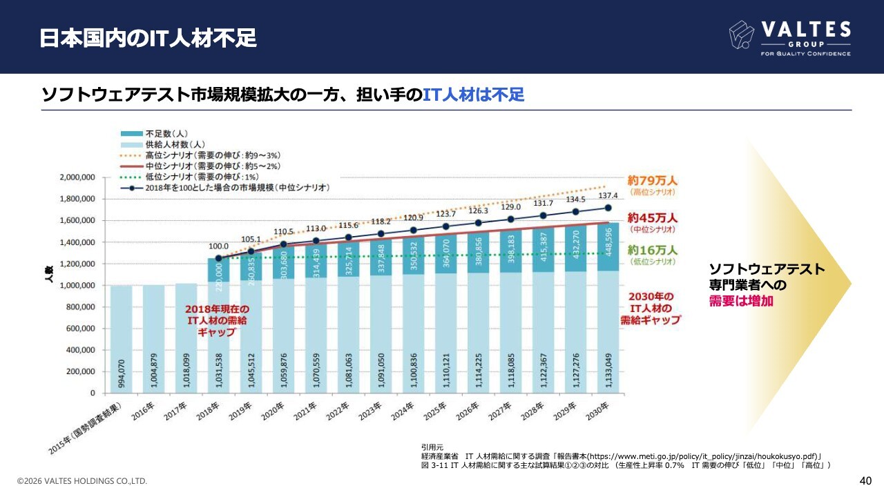 当社としてはこれらIT人材の不足が、ソフトウェアテスト専門事業者へのアウトソーシング需要の喚起につながり、結果として、こと国内においてはソフトウェアテスト市場そのものの拡大につながるものと認識しています。