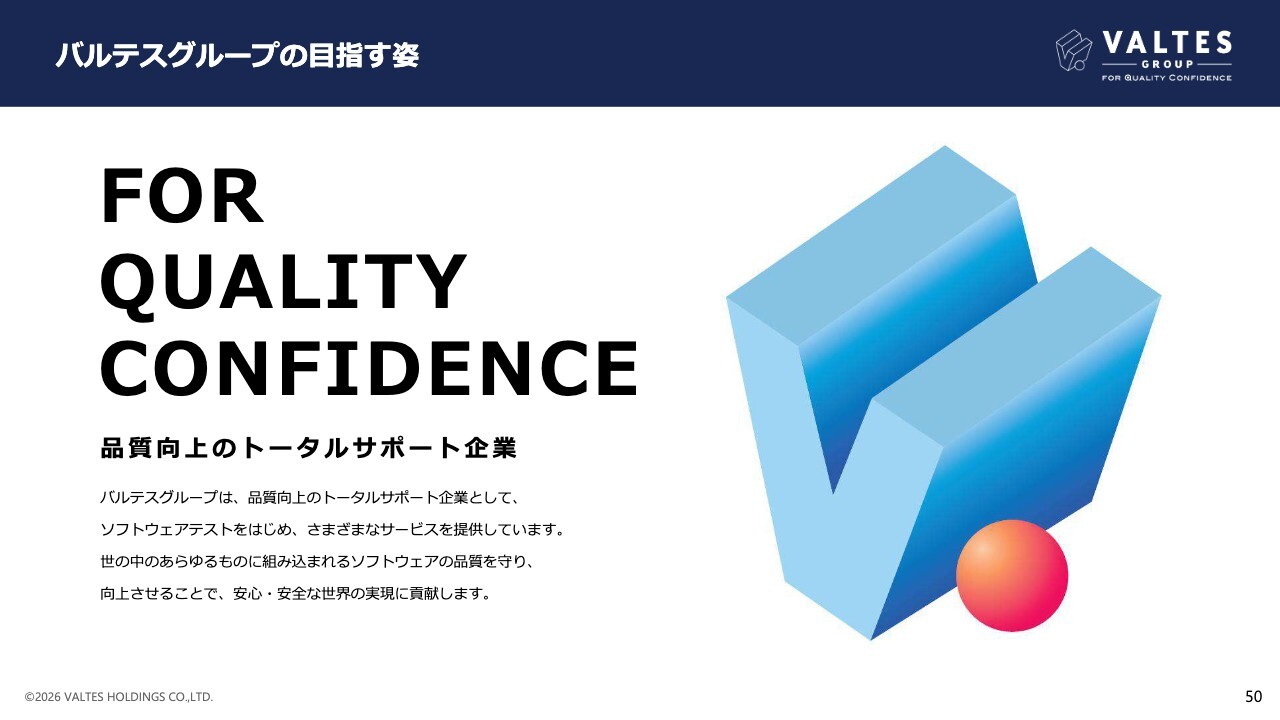 当社グループは目指すべき姿として「FOR QUALITY CONFIDENCE」「品質向上のトータルサポート企業」を掲げ、世の中のあらゆるものに組み込まれるソフトウェアの品質を守り、向上させることで、安心・安全な世界の実現に貢献していきます。