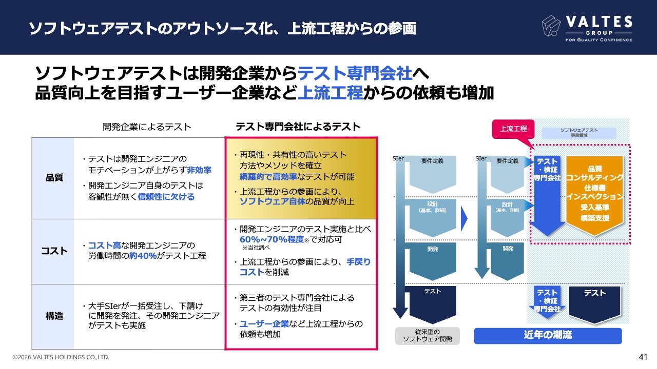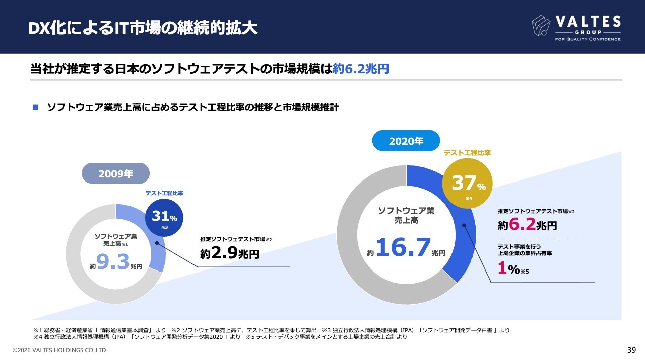 ソフトウェア開発のアウトソーシングが進む中で、テスト専業企業の市場占有率は依然として低く、今後の開拓余地が大きい市場と捉えています。