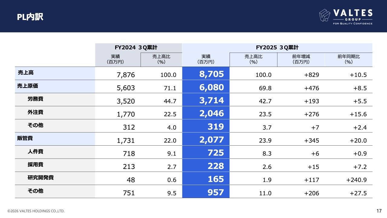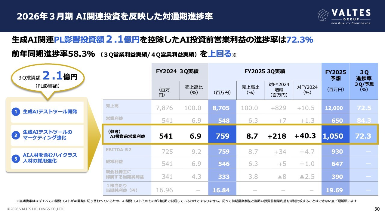 AI投資影響を排した実質的な営業利益は7億5,900万円となりました。年間計画値の10億5,000万円に対し進捗率は72.3パーセントとなり、前年同期第3四半期の進捗率58.3パーセントを上回る結果となっています。