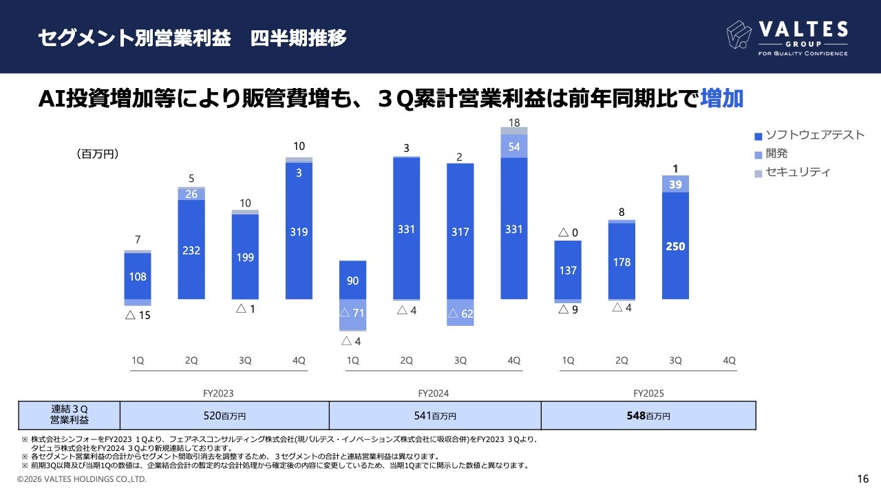 セグメント別営業利益の四半期推移です。ソフトウェアテスト事業は、生成AIテストツール開発を含む積極的な投資により、前年同期比で減益となっていますが、計画を上回る進捗となっています。