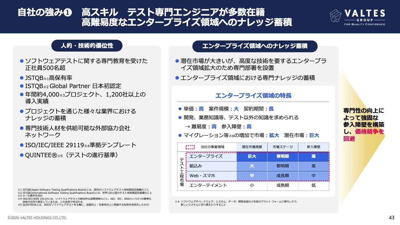 1つ目の強みは、高スキルテスト専門エンジニアが多数在籍し高難易度なエンタープライズ領域のナレッジを蓄積している点です。