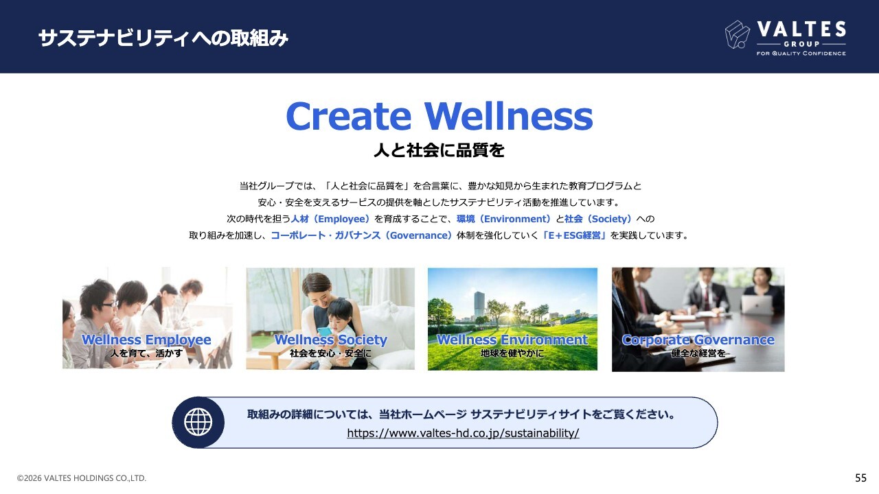 サステナビリティへの取り組みです。当社グループでは、「人と社会に品質を」を合言葉に、豊かな知見から生まれた教育プログラムと、安心・安全を支えるサービスの提供を軸としたサステナビリティ活動を推進しています。