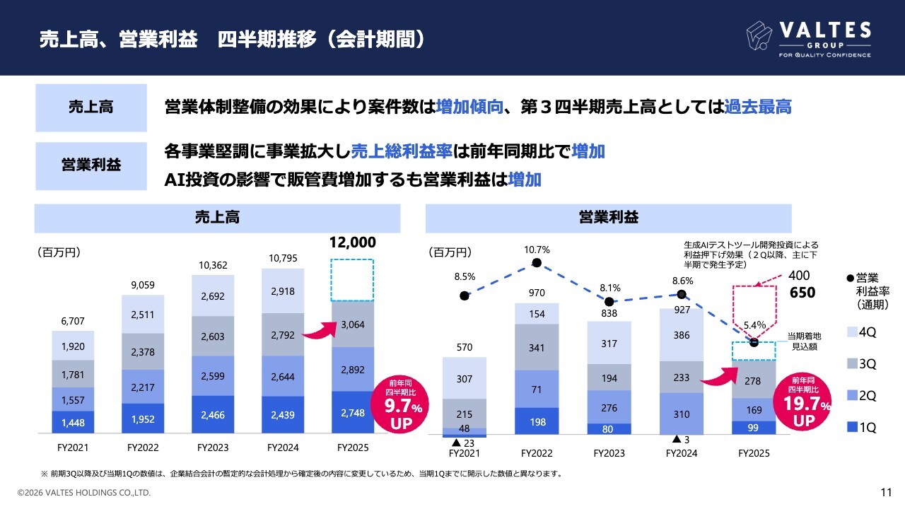 一方で、生成AIテストツール開発などの投資や、のれん償却費、株主優待コストの増加により販管費も増加したため、営業利益および当期純利益は前年並みに推移しました。単価は順調に上昇し、一般案件・ツール案件ともに件数が増加しています。