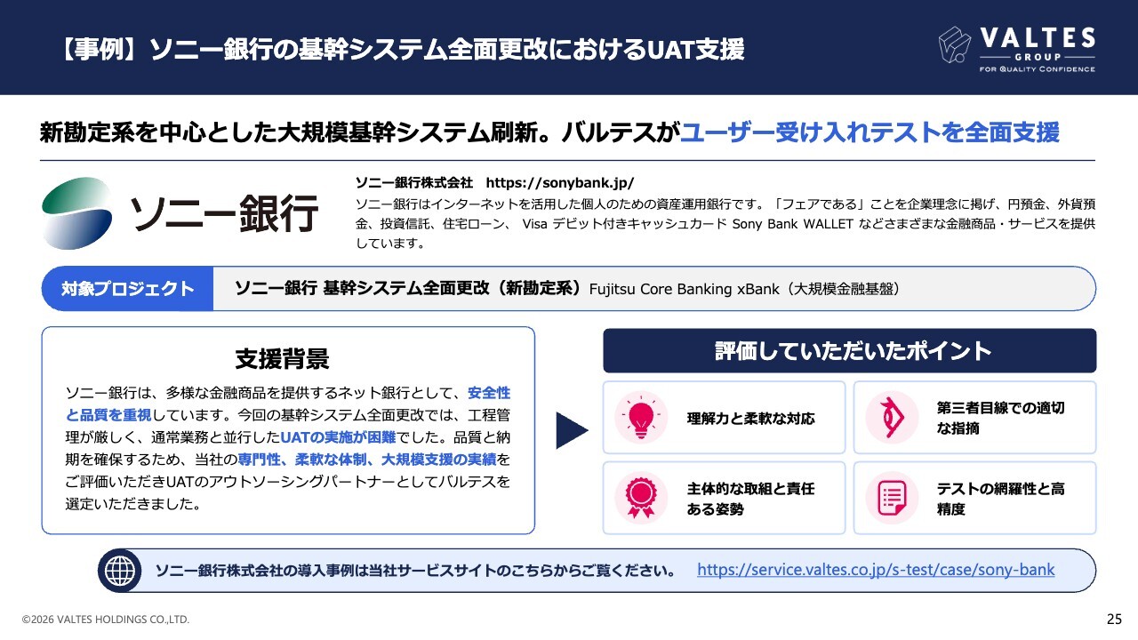 支援の背景としては、安全性と品質の担保が必須である金融基幹システム全面更改において、通常業務と並行してスムーズなUAT実施を進めるため、バルテスの高い専門性や体制、大規模支援の実績をご評価いただき、UATのアウトソーシングパートナーとしてバルテスを選定いただきました。