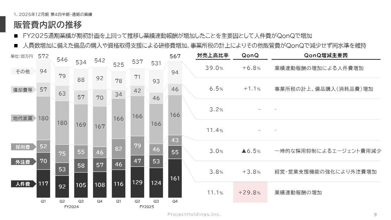 一方で、2025年通期の業績が計画を上回ったことで、業績連動的な賞与が増加し、人件費が増えています。また、期末特有のコストの影響で、その他の販管費が特殊要因があった前の第3四半期と同水準の高い水準にとどまりました。この結果、売上高に占める販管費の比率は一時的に上昇しています。