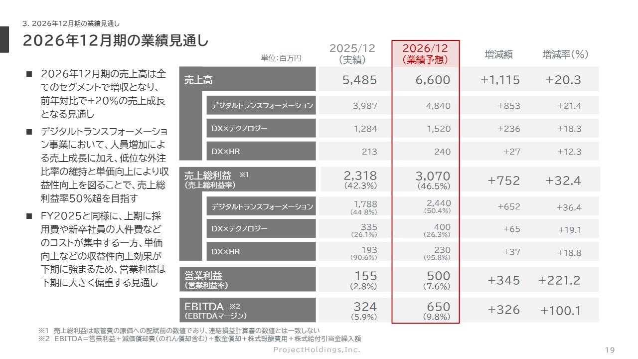今期の業績見通しについてお話しします。2026年12月期の業績見通しについてですが、売上高はすべてのセグメントで増収となり、前年対比約20パーセントの売上成長となる66億円を見込んでいます。