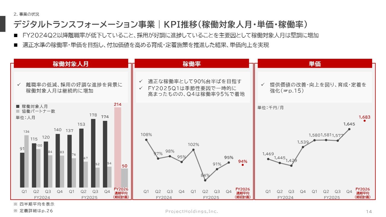 各事業のトピックスおよびKPIについてお話しします。まず、デジタルトランスフォーメーション事業のKPIについてですが、今回から分解の仕方を少し変更しました。定義の詳細はスライド26ページのAppendixに掲載しています。左から「稼働対象人月」「稼働率」「単価」の3つに分解して示しています。