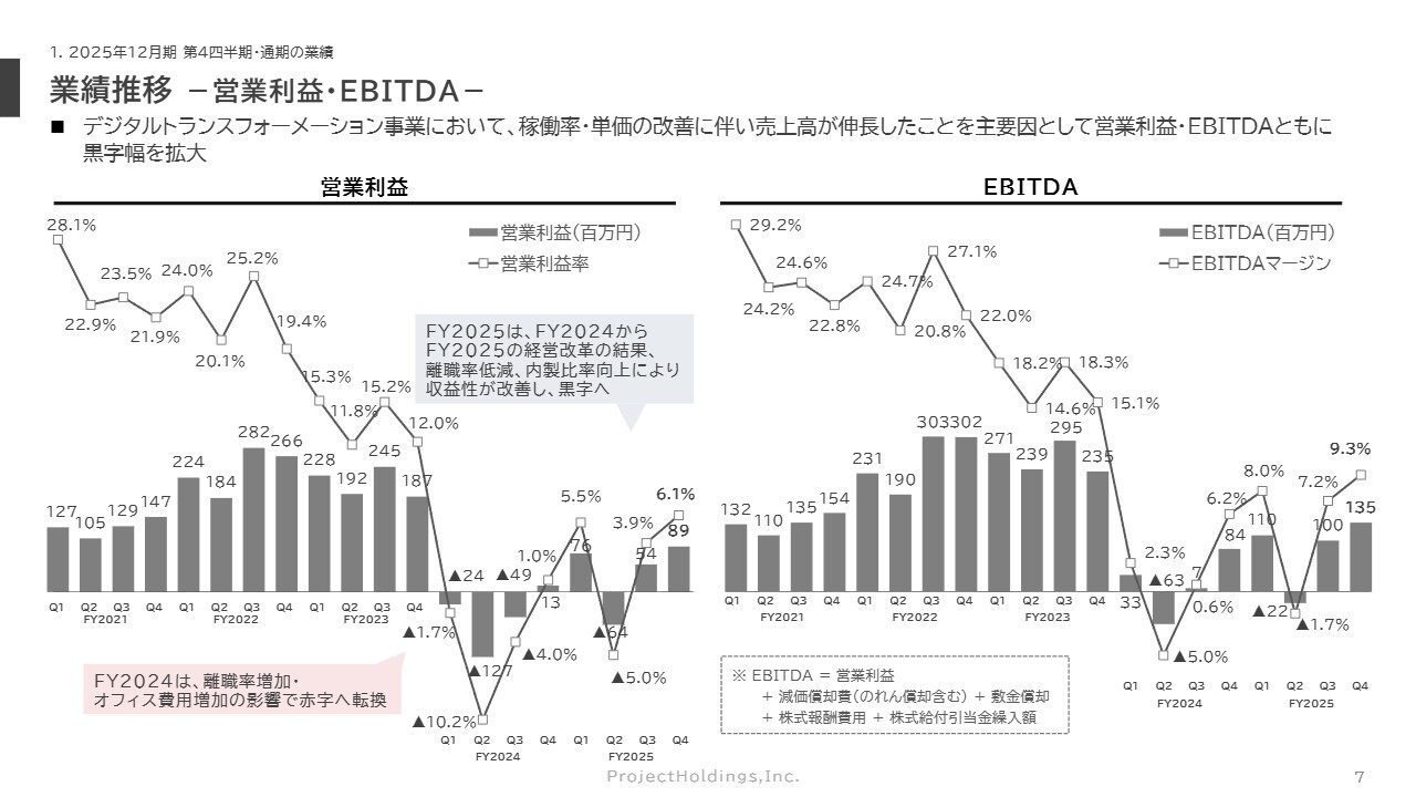 これを受け、2024年度から2025年度にかけて、人事制度改革やガバナンス強化を含む経営改革を実施した結果、2025年度には離職率の低下や内製比率の向上により、収益性が改善してきました。