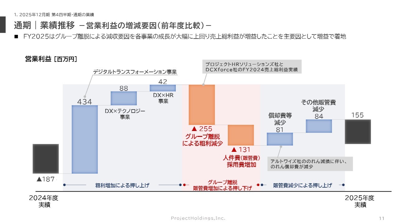 加えて、2024年度には期中および期末に計2社のグループ会社が離脱しましたが、2025年度にはその影響を吸収して黒字化を達成しました。また、グループ離脱の影響を除くと、売上はYonYで15.7パーセントの成長を実現しています。