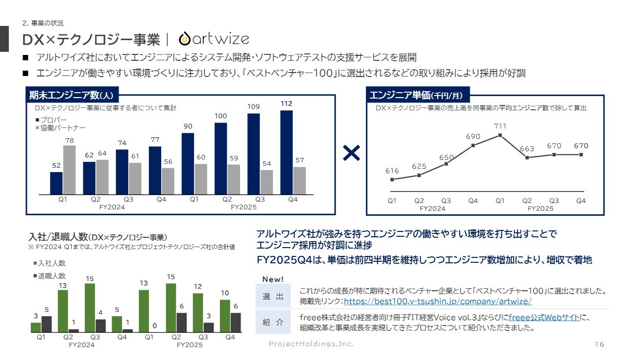 DX×テクノロジー事業についてです。この事業では、アルトワイズ社において、エンジニアによるシステム開発やソフトウェアテストの支援サービスを展開しています。エンジニアが働きやすい環境作りに注力することで、採用が好調に推移しています。