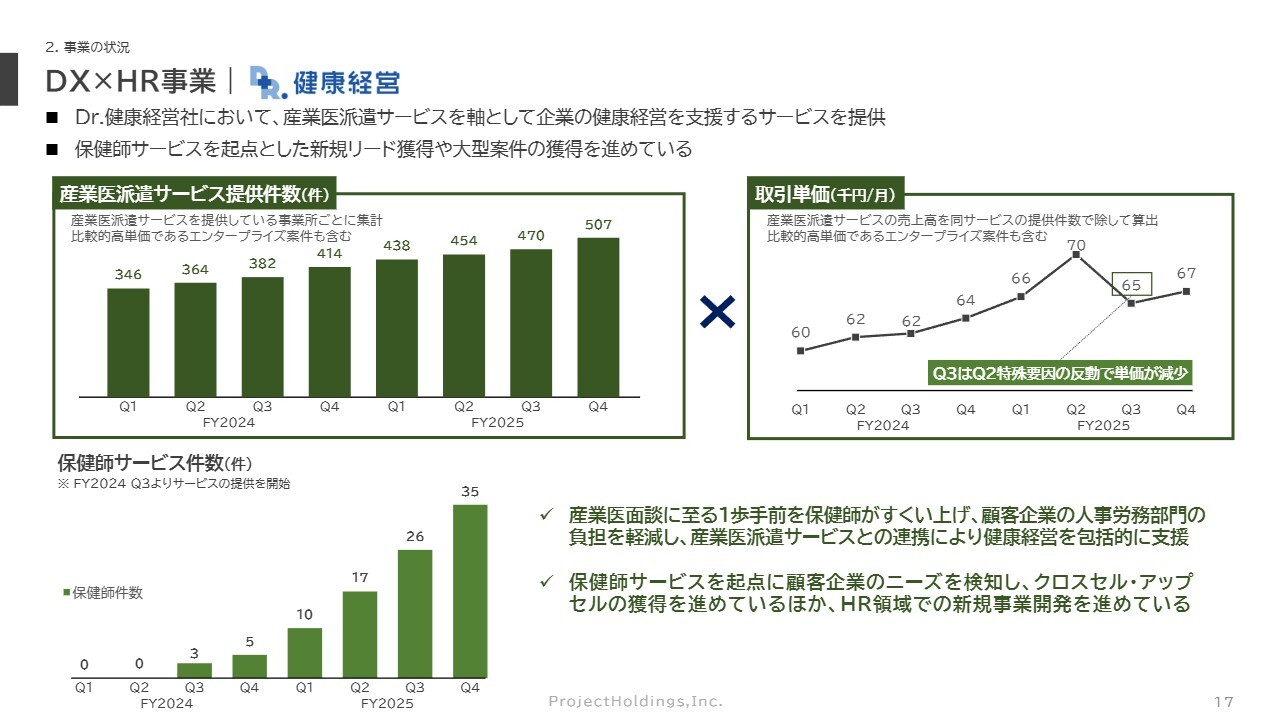 DX×HR事業についてです。こちらは、グループ会社であるDr.健康経営社が、産業医派遣サービスを軸に企業の健康経営を支援するサービスを提供しています。