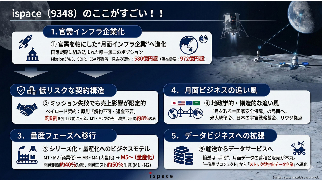 1点目は「官需を軸にした“月面インフラ企業”へ進化」です。国家戦略に組み込まれた唯一無二のポジションであり、月へ行くという点において他に例を見ない企業です。当然ながら、月に行くには非常に多くの資金が必要となります。しかし、すでに見込み契約として580億円以上、さらに潜在需要として970億円以上が見込まれています。
