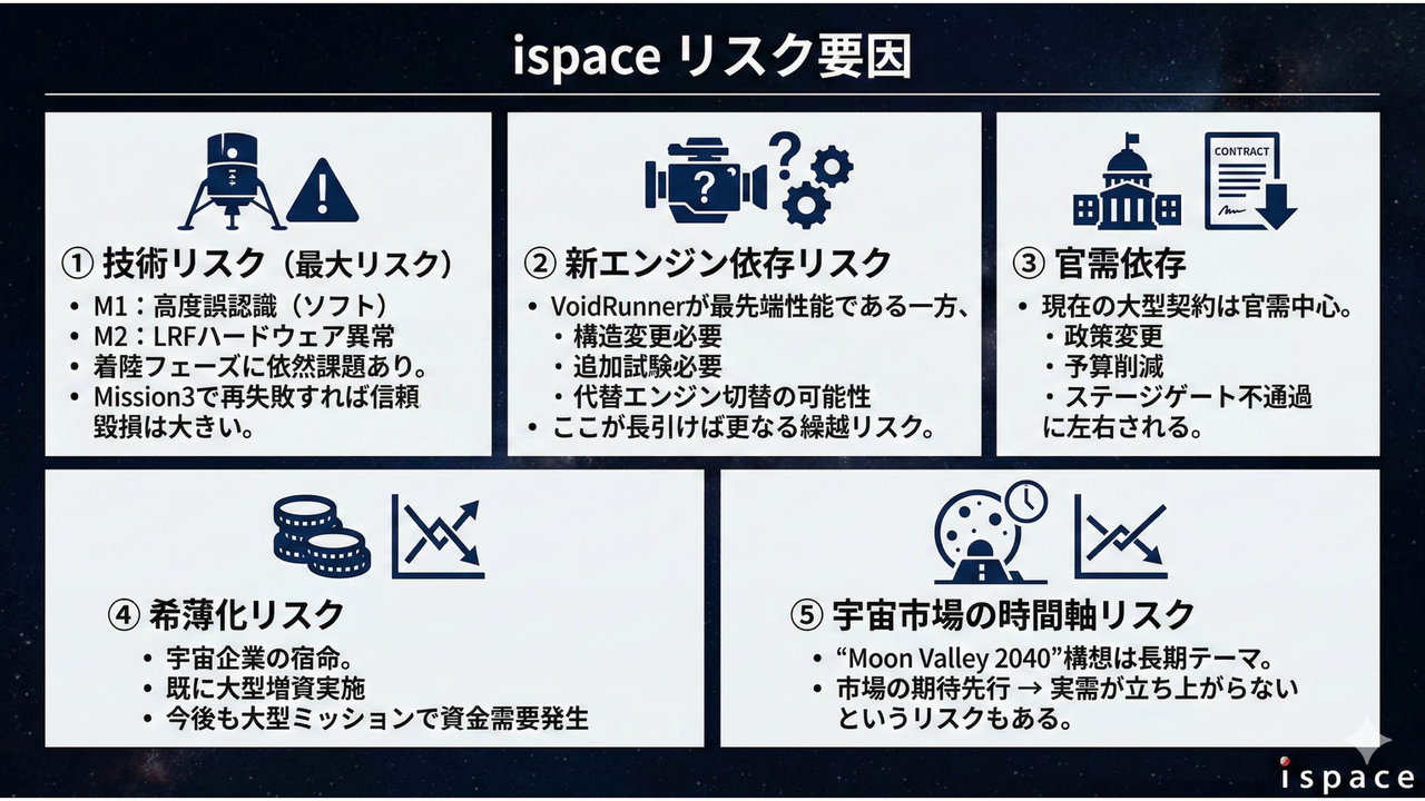 3点目は「官需依存」です。先ほど追い風についてお話ししましたが、追い風とリスクは表裏一体です。現在の大型契約は官需を中心としており、場合によっては政策変更や予算削減などがispaceにとって逆風となる可能性も否定できません。したがって、将来的にはリスク要因となり得ます。