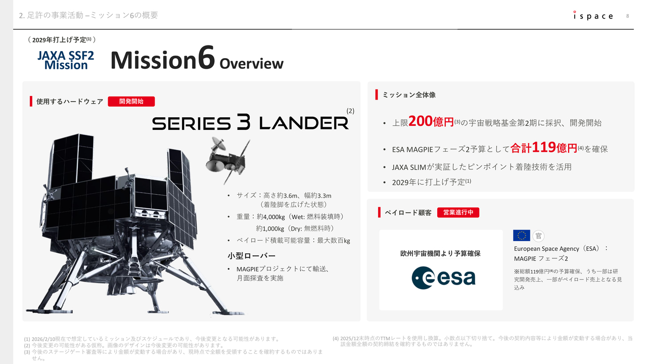 袴田:最近、次のミッションであるMission 6で、JAXAの宇宙戦略基金事業第2期の案件を獲得し、最大200億円の支援を受けられることになりました。また、ESA(European Space Agency:欧州宇宙機関)の案件も予算確保済みで、これから契約を締結する予定です。