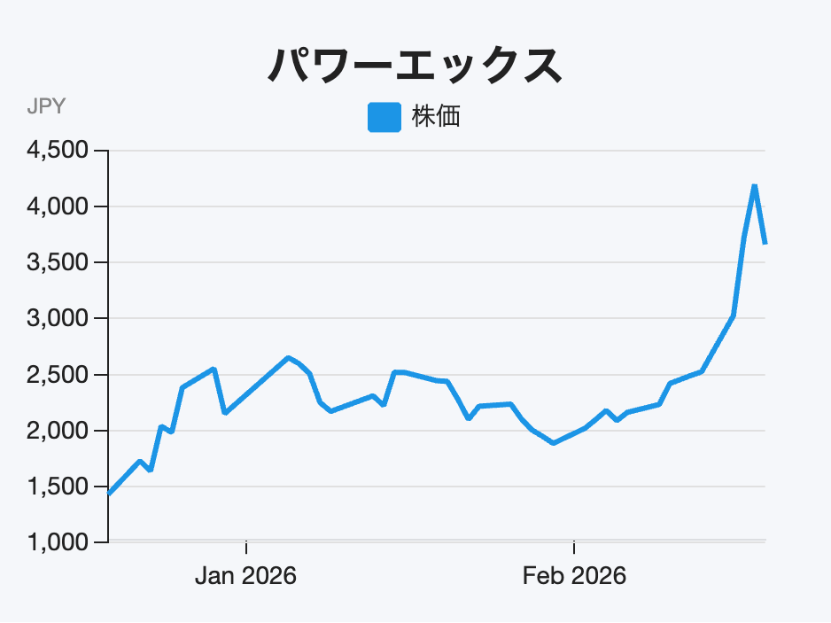 2025年12月にIPOしたばかりの企業で、蓄電型発電所を製作しています。2月13日の大引け後に決算を発表し、2026年12月期は売上高が前期比96.8パーセント増の380億円、営業損益は20から25億円の黒字(前期は6.7億円の赤字)と、大幅な増収・黒字転換の計画です。
