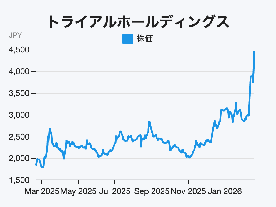 スーパー「トライアル」を展開しています。少し前には、西友の買収でも大きな話題を集めました。2月12日の大引け後に決算を発表し、2026年6月期の第2四半期は売上高が前年同期比67.0パーセント増の6,741億円、営業利益は同71.9パーセント増の166億円と大幅な増収増益で着地しています。また、同時に発表した中期経営計画では2029年6月期の目標として、売上高1.6兆円、営業利益640億円を掲げました。