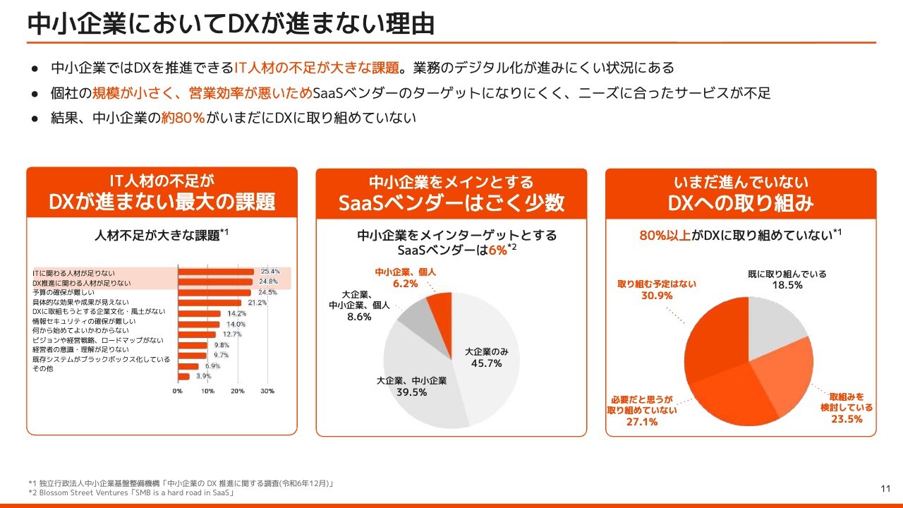 中小企業のマーケットは1社ごとの規模が小さく、営業効率が悪いです。そのため参入するベンダーが限られ、ニーズに合ったサービスが不足しています。また、中小企業にはITに不慣れな人が多く、AIやSaaSを自力で使いこなすのが難しい状況です。