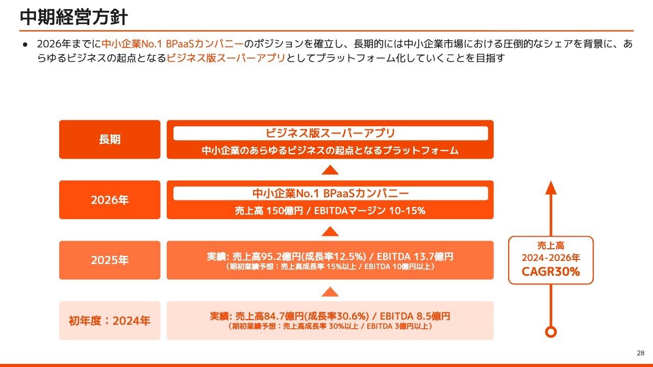 中期経営方針として、2026年までに中小企業No.1を目指すBPaaSカンパニーとなり、BPaaSを次の柱として確立することを掲げています。そして、長期では「あらゆるビジネスの起点となるプラットフォーム」として「ビジネス版スーパーアプリ」を目指していく考えです。