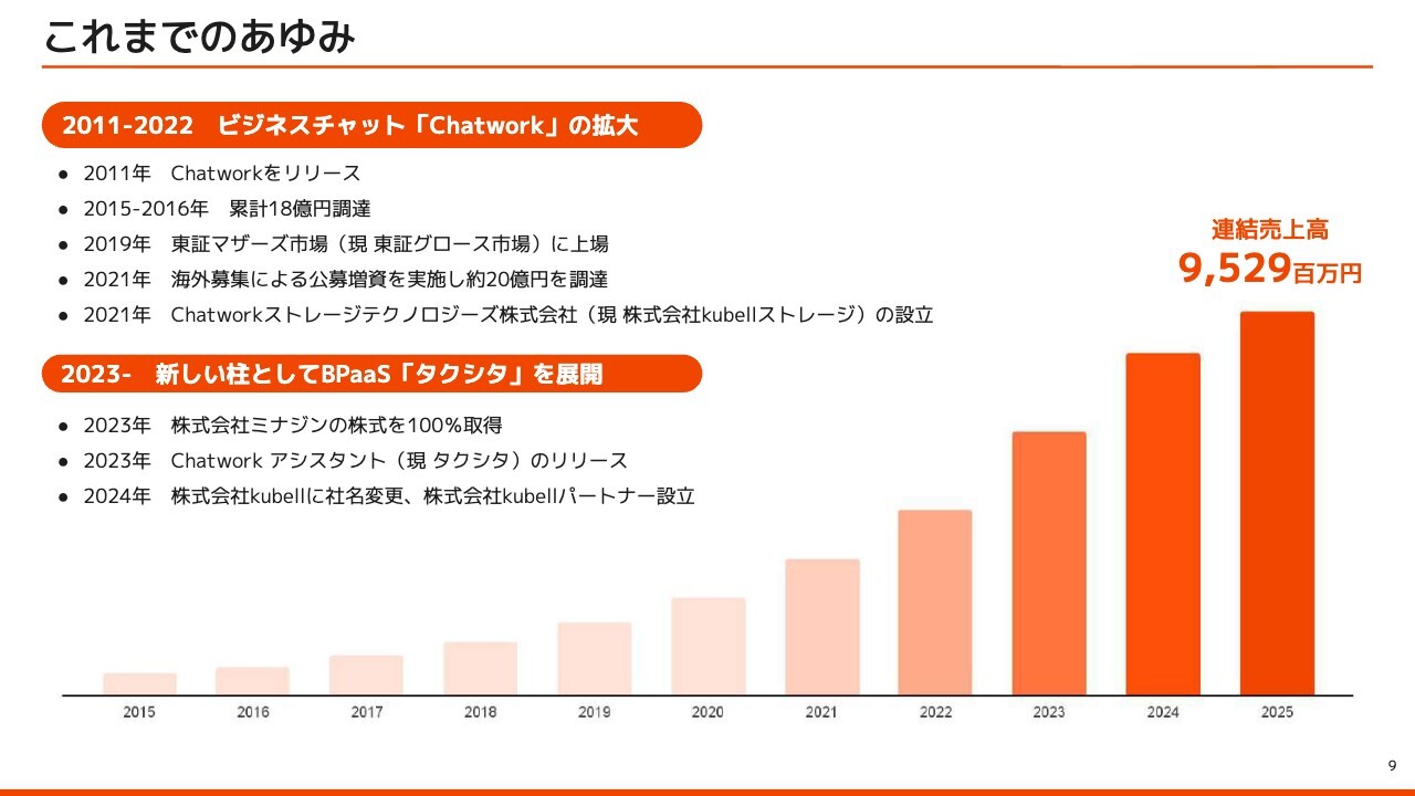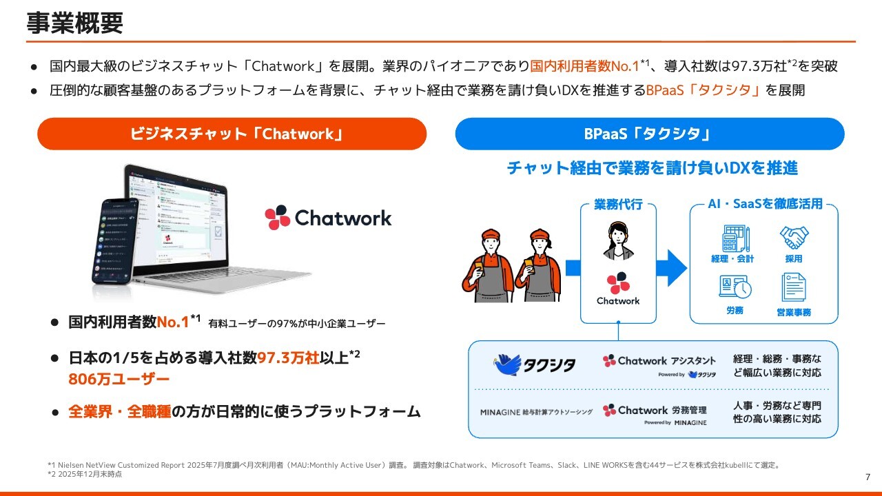 山本:事業概要は、先ほどご紹介した国内最大級のビジネスチャット「Chatwork」が、現在の売上の9割を占める規模となっています。