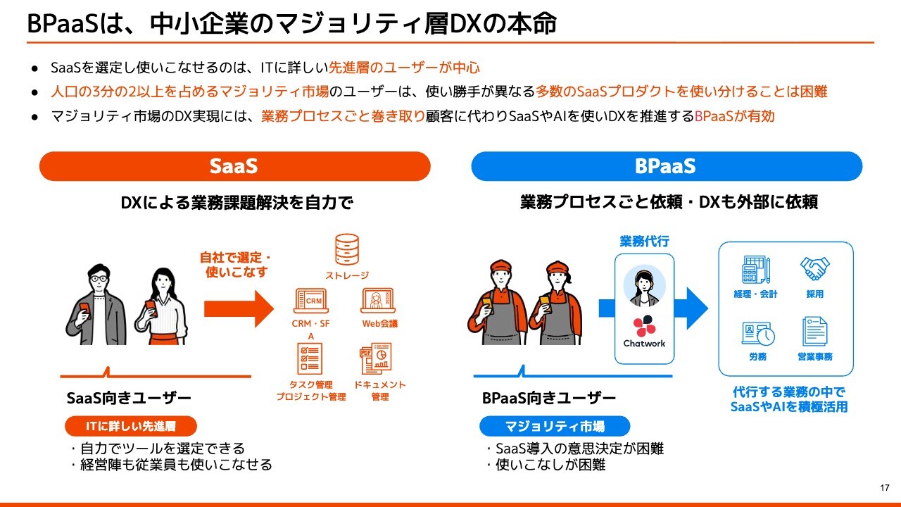 「Chatwork」で接点を持ち、それに加えてSaaSではなくBPaaSを提供することで、中小企業の方々に本質的なDXを展開していきたいと思います。