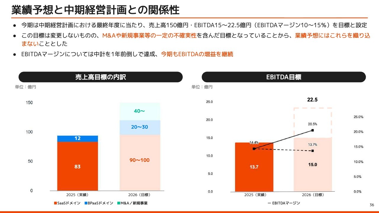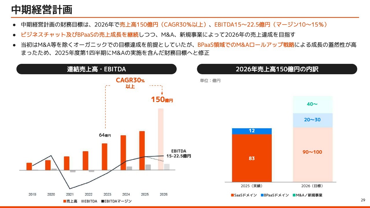 山本:財務計画では、2026年に売上高150億円、CAGR30パーセント以上の成長を目標としています。また、EBITDAは15億円から22億5,000万円を目標としています。