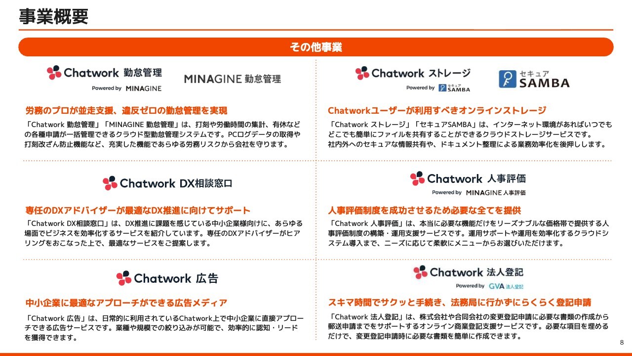 山本:「Chatwork」以外にも、「Chatwork 勤怠管理」「Chatwork ストレージ」といった、グループ企業が提供するSaaSサービスをいくつか展開しています。DX相談窓口、人事評価、広告、法人登記などさまざまなサービスを展開しているため、ぜひご確認ください。