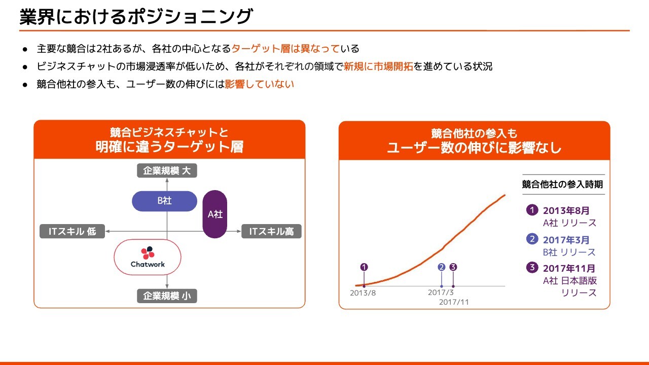 主要な競合であるこの2社が先ほど質問で挙げていただいたような企業ですが、当社の場合、ITに詳しくない方や、規模がそれほど大きくない企業をターゲットにポジショニングを取っています。