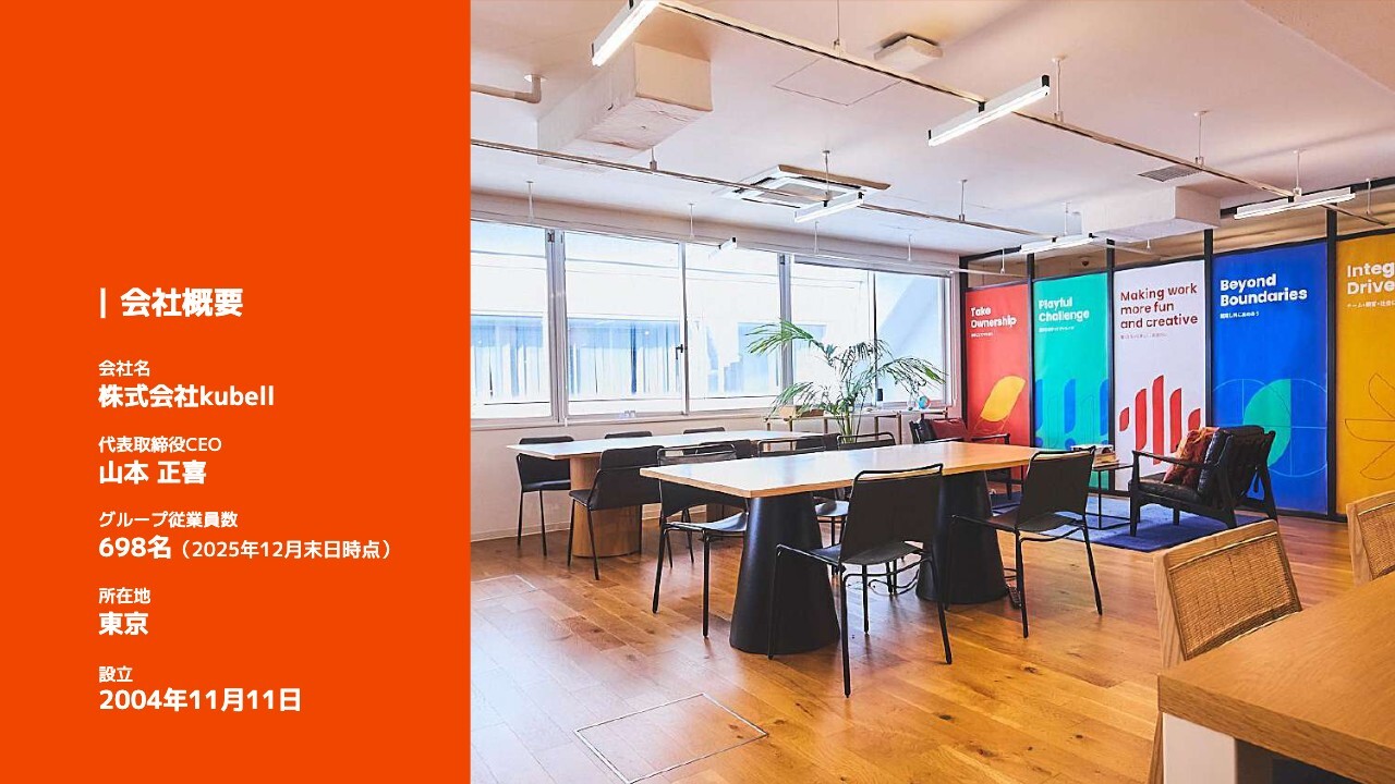 山本:会社概要についてご説明します。株式会社kubellは、2025年12月末時点でグループ従業員数が698名となり、現在は700名を超える規模になっています。