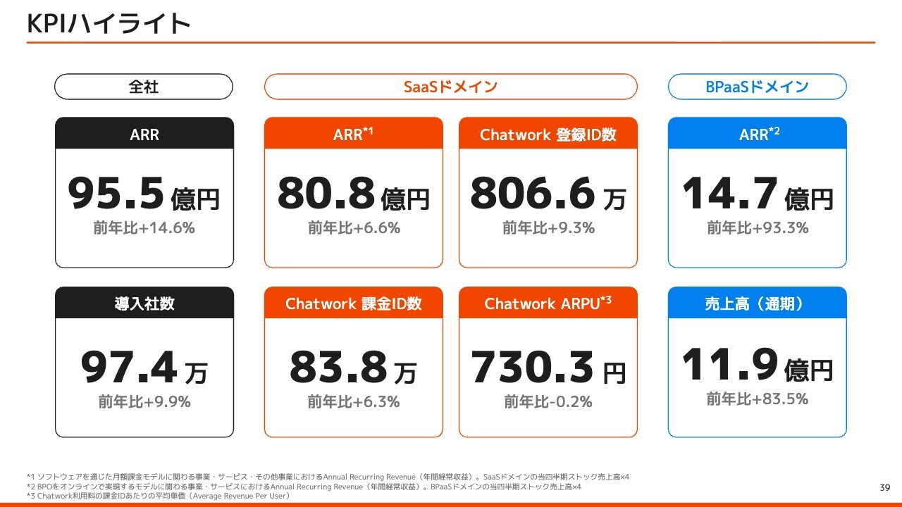 SaaSドメインでは「Chatwork」および「Chatwork」以外のSaaSを含めたかたちとなり、「Chatwork」は全体の約9割を占めると考えていただければと思います。ARRは80億円を超えています。また、登録ID数は806万、課金ID数は83万、ARPUは730円となっています。