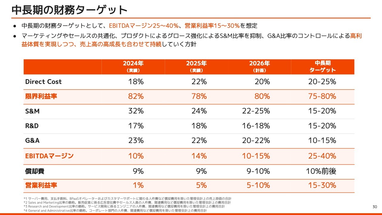 中長期的にはS&Mのコスト比率を大幅に下げ、R&Dは一定の横ばいとし、G&Aを削減することで、EBITDAマージンを25パーセントから40パーセントにすることを目標としています。