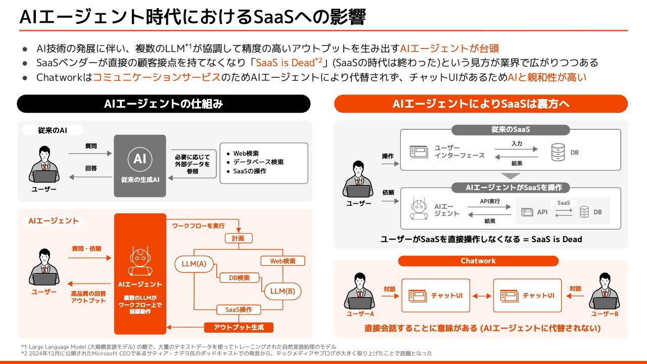 しかし、コミュニケーションにおいては直接の対話がなにより重要です。つまり、私たちが提供する「Chatwork」のようなビジネスチャットにおいて、「SaaS is Dead」のようにAIが代替的に操作する世界観はあまり当てはまらないと思っています。