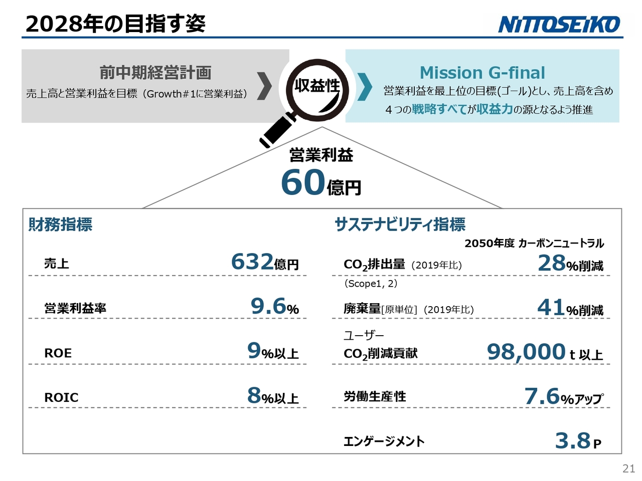荒賀:2028年の目指す姿として、「営業利益60億円」をテーマに掲げて進めていきたいと考えています。これまでの中期経営計画と異なる点は、すべての取り組みが「営業利益60億円」につながることを意識し、改革を進めるという点です。