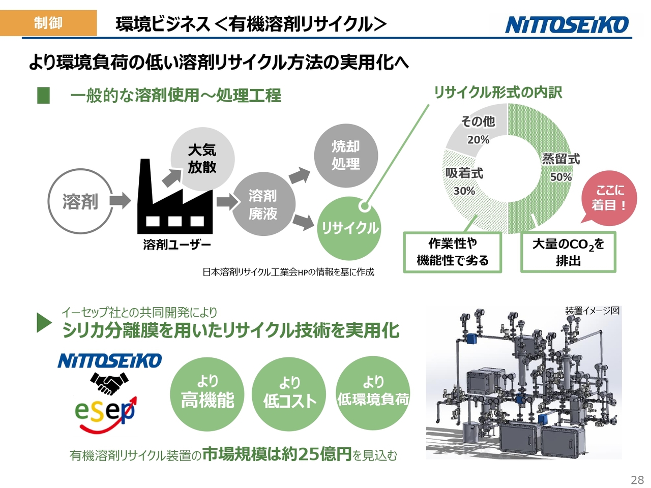 当社は、ベンチャー企業のイーセップ株式会社と共同で、より高機能・低コスト・低環境負荷のリサイクル方式として、シリカ分離膜の溶剤リサイクル装置を開発しました。昨年にはデモ機の展示を行い、現在、量産体制に向けた取り組みを進めています。