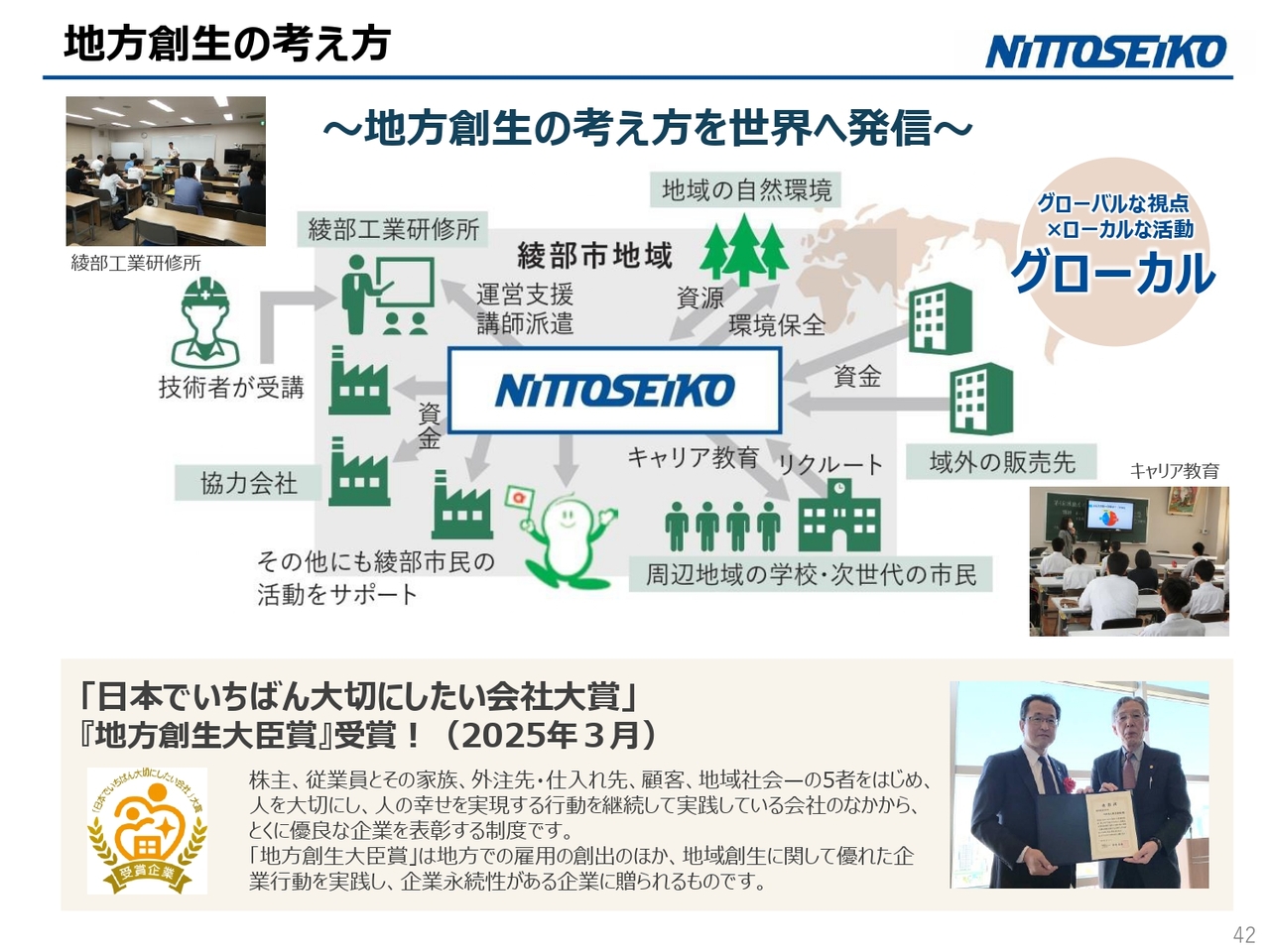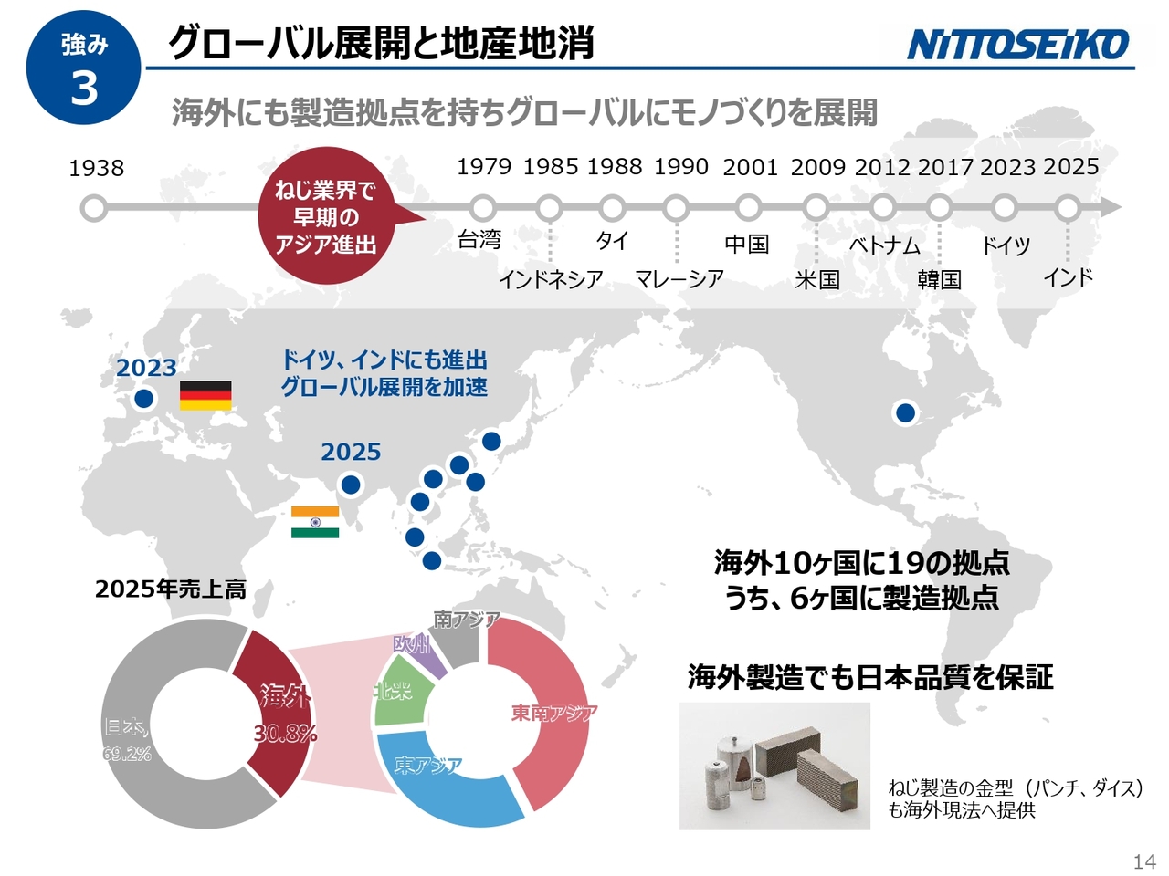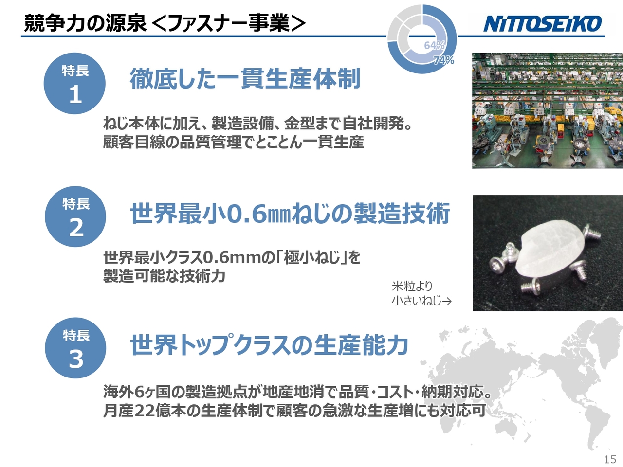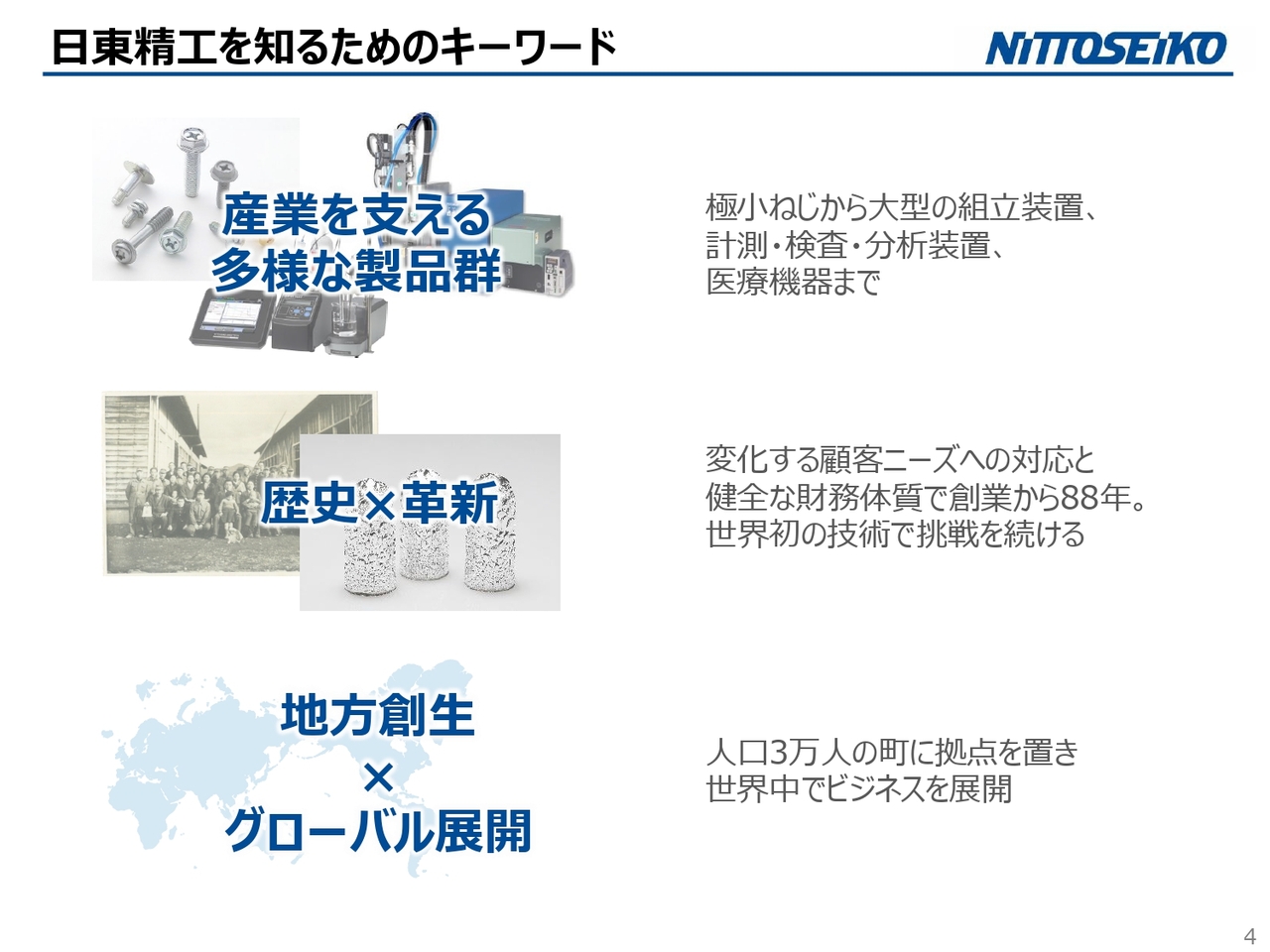 さらに、「地方創生とグローバル展開」を掲げ、人口3万人の町に拠点を置きながら、世界中でビジネス展開している会社です。この3点が日東精工の大きな特徴です。