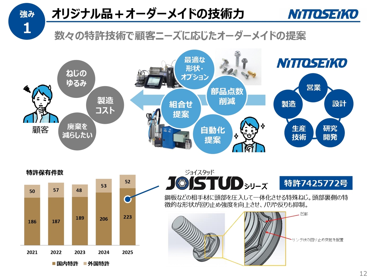 また、多くの特許技術を有しており、オリジナル製品が多数あります。スライドにもあるように、昨年末時点で275件の特許を有しています。その中に、スライドに記載の「JOISTUD(ジョイスタッド)」という製品があります。このように、モノづくりの現場でお客さまのお困りごとを解決するために製品化し、パテント品を開発していくことが、当社の得意分野です。